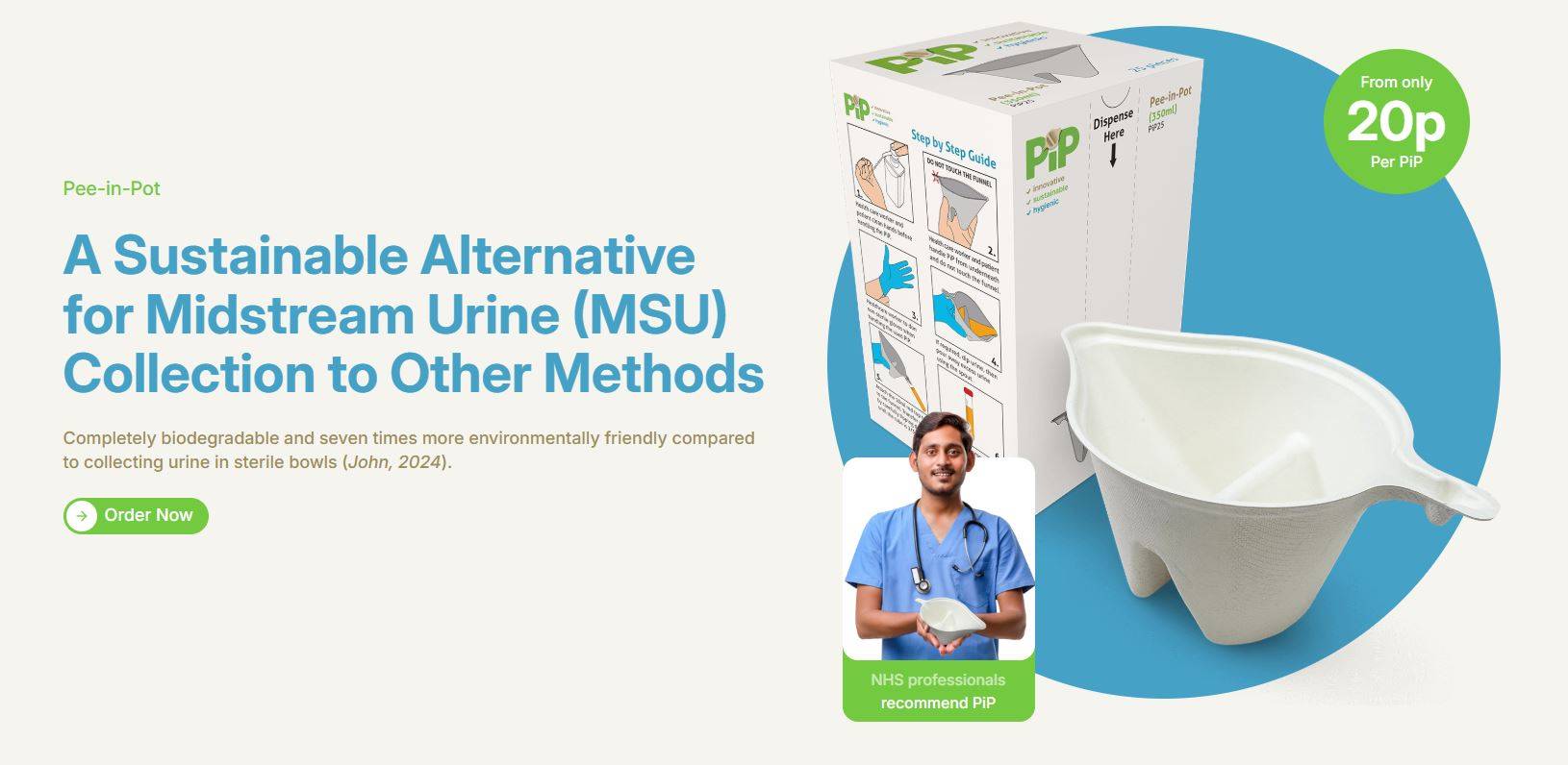 A detailed comparison has been undertaken of conventional (lean) urine collection processes and compared to the PiP by Mr Joseph John, Urology Clinical Fellow and GIRFT Fellow (Sustainability), that tests the hypothesis that Thermofibre, made from blended bamboo fiber and sugar cane pulp at high temperatures in clean room conditions, is a safe alternative to single-use sterile plastic for collecting mid-stream urine specimens without affecting culture results. The results demonstrated that there was an accepted level of equivalency. It also demonstrated that the PiP produces net carbon savings of between 77-85% across the MSU collection pathway.